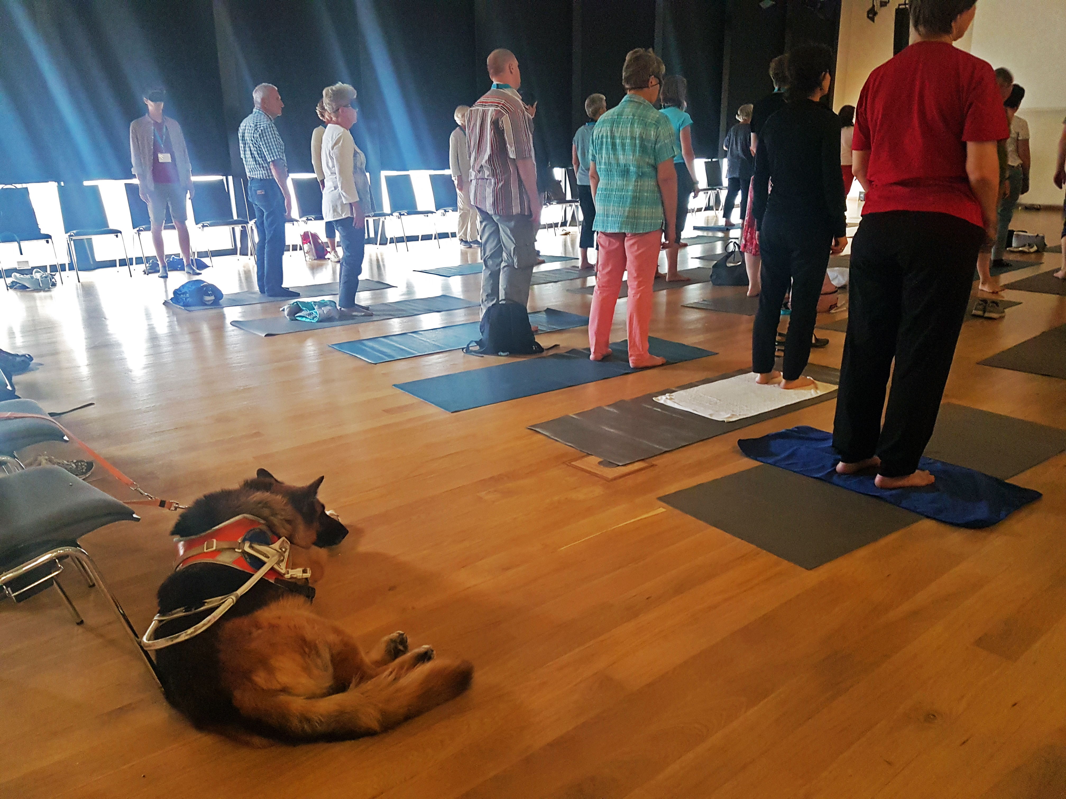 Das aufgeregte Gewusel verstummte angenehm schnell beim einstimmenden dreifachen „Om“ von Tobias. Souverän und entspannt begann er sich und seine beiden Assistentinnen (eine sehende und eine sehbeeinträchtigte Yogini) vorzustellen und uns auf die Yogastunde vorzubereiten. Zu Beginn haben wir uns auf den Rücken gelegt, reingefühlt und uns versucht zu entspannen. Die folgenden zwei Stunden führte uns Tobias durch einfache Asanas (Körperhaltungen) mit kleinen Herausforderungen durch langes Halten. Es wurde geatmet, gestöhnt und gekichert – wie in jeder anderen Yoga Stunde auch. Seine Assistentinnen bewegten sich achtsam durch den Raum und korrigierten durch sanftes Handauflegen mal diese und jene Position. Eigentlich eine „Klasse“ wie jede andere auch – mit einer Besonderheit: der still entspannende (Blinden-)Hund begann plötzlich zu bellen, als wir uns in den Vierfüßler-Stand begaben – sicherlich irritiert, dass viele Menschen sich zeitgleich in eine Hunde-ähnliche Position begaben. Nach kurzer Erheiterung aller, war die Konzentration aber wieder bei jedem einzelnen und seinem Körper.