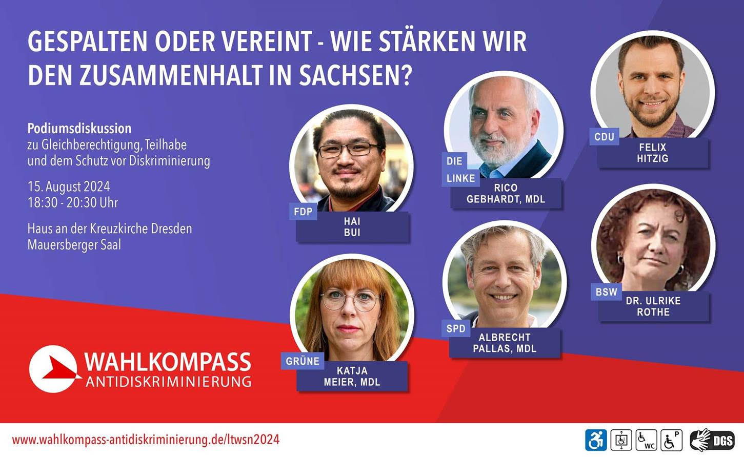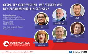 Wir wollen es wissen und laden Sie herzlich zur Podiumsdiskussion am 15.08.2024 mit sechs Vertreter*innen der sächsischen Parteien ein, die in der kommenden Legislatur die Antidiskriminierungspolitik in Sachsen mitgestalten wollen:
