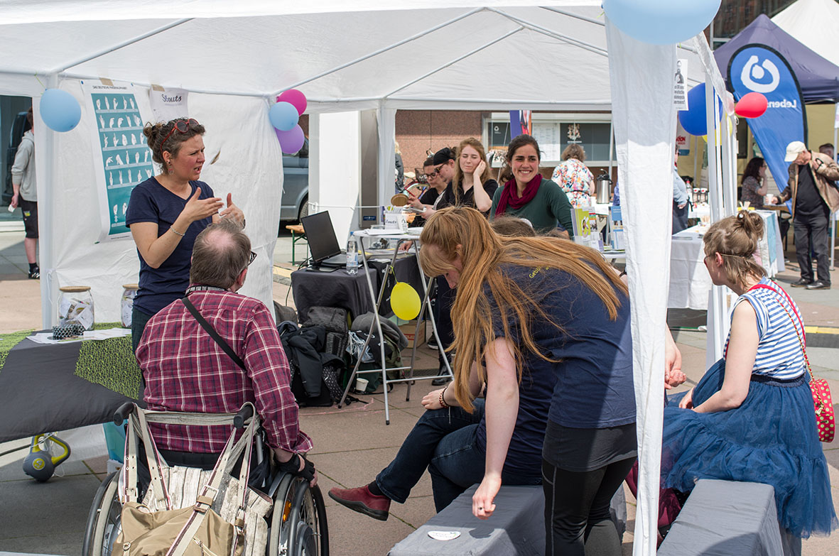 Der Landesverband Selbsthilfe Körperbehinderter Sachsen (LSKS) bot u. a. verschiedene Aktionen zum Thema Mobilität im öffentlichen Raum an. So konnten Besucher*innen beim Rollstuhl-Parcours und den angebotenen Rundgängen auf dem Dresdner Neumarkt selbst erfahren, wie schon kleinste alltägliche Hindernisse die Mobilität von Betroffenen wie Rollstuhlfahrern oder Blinden einschränken können.