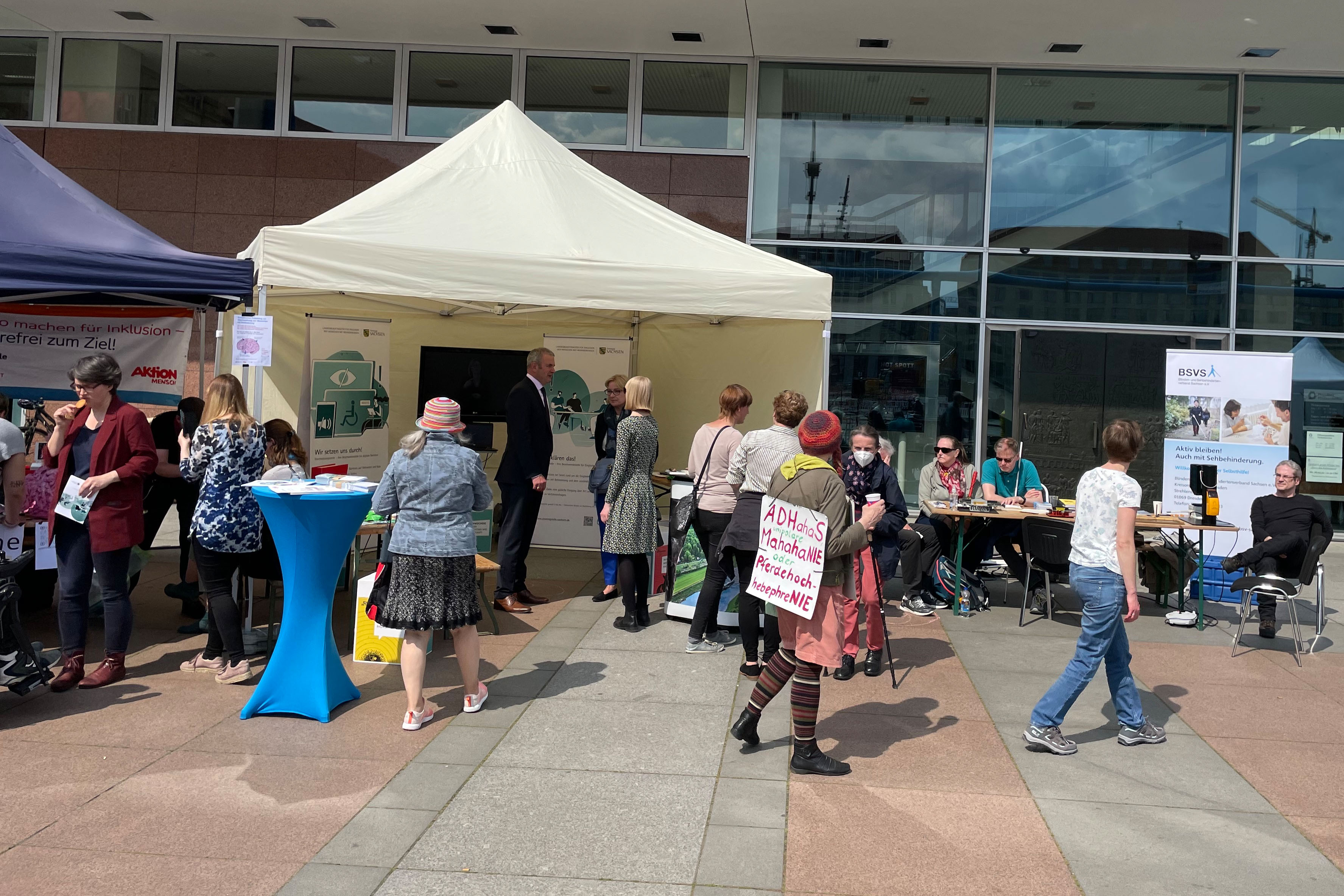 Anlässlich dieses Protesttages veranstaltete die Landesarbeitsgemeinschaft Selbsthilfe Sachsen gemeinsam mit vielen Partner*innen und dem Inklusionsnetzwerk Sachsen am 05. Mai 2022 den "Markt der Inklusion – weniger Barrieren, mehr Teilhabe" in Dresden. Vor dem Kulturpalast konnten Besucher*innen von 14 bis 17 Uhr bei schönstem Sonnenschein und Jazzklängen an zahlreichen Aktionen rund um Inklusion und Barrierefreiheit teilnehmen und sich an den Ständen der beteiligten Partner*innen zu diesen Themen informieren.