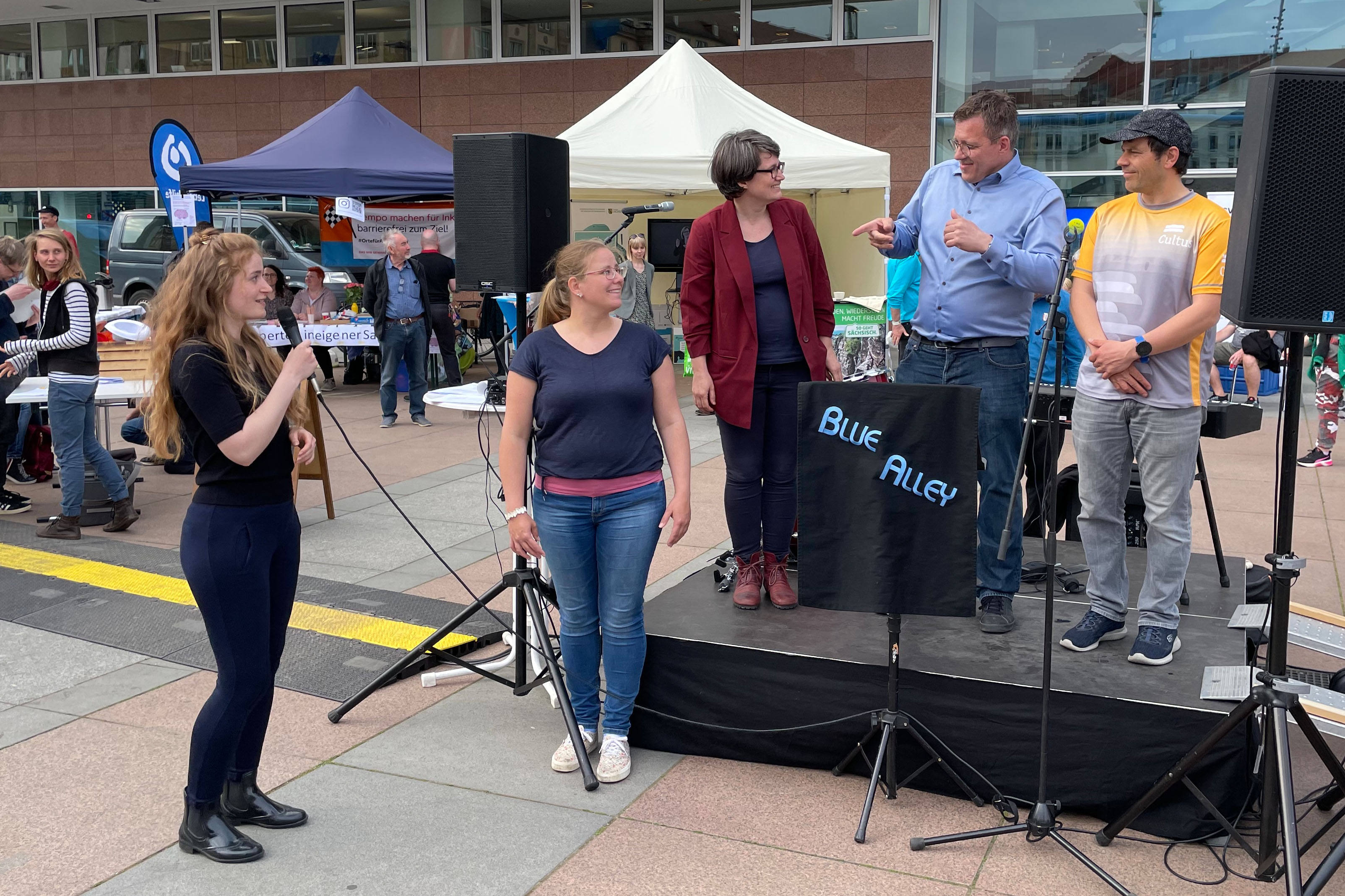 Die Veranstaltungsbühne diente nicht nur der musikalischen Untermalung durch die Jazzband „Blue Alley“, sie konnte auch von allen Teilnehmer*innen für Protestverkündungen genutzt werden. So wurden hier u. a. Forderungen für eine gerechte Entlohnung von Menschen mit Behinderungen in Werkstätten laut.