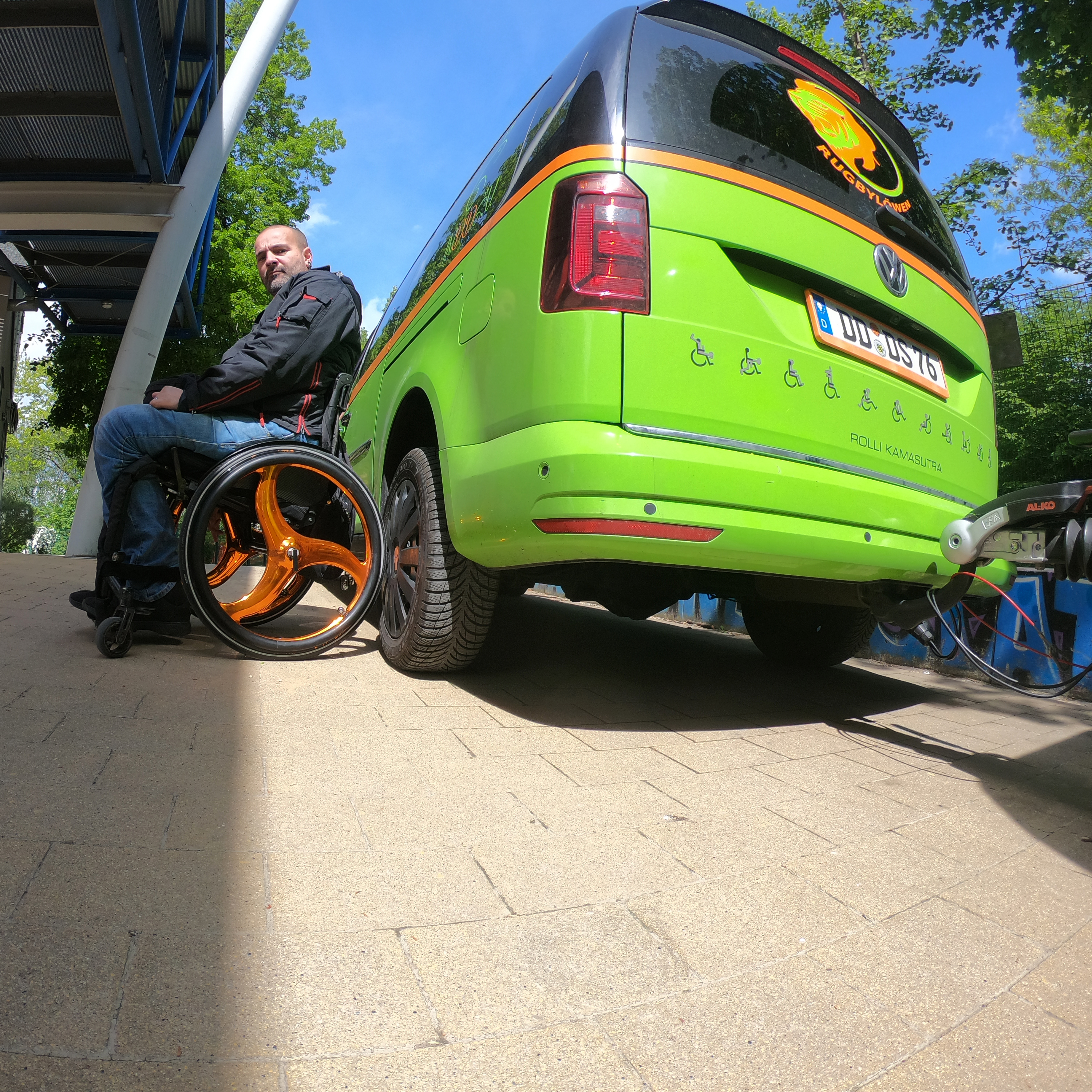 Wir sind seit 7-8 Jahren auf der Messe „aktiv vital“. Die ersten Jahre war es nur mit dem Rollstuhl Rugby. Ich hatte das den Dresdner Spielern angeboten, aber die hatten keinen Bock darauf. Deshalb habe ich es 2011 den Leipzigern angeboten, auf der Messe aufzutreten. Das hatten wir damals mit dem DSV und der Barmer eingerührt und seitdem ist es so. 2014 wurde ich dann gefragt ob ich zum Inklusionssport-Tag hierher ins Emmers kommen würde. Seitdem findet dieser Tag jedes Jahr statt. Seit 2014 arbeite ich auch hier in der Holzwerkstatt ehrenamtlich. Später haben wir dann einen eigenen Verein gegründet, der in die sportliche Richtung ging - Rollstuhl Rugby und Rollstuhlparcours. Am 29 April 2015 haben wir den Verein hier in diesem Haus gegründet. 2017 kam dann über das Staatsministerium die Kampagne „behindern verhindern“. Die offizielle Eröffnung dieser Kampagne haben wir auch hier im Emmers gemacht. Mit der Presse und den einzelnen Schirmherren für die einzelnen Bereiche. Also Rollstuhl, blind, taub in jedem Bereich ist ein anderer verantwortlich. Im Bereich Rollstuhl ist es der Horst Wehner, der Vizepräsident vom sächsischen Landtag. Wir haben also die Eröffnung hier gemacht und die Ministerin hat mich zum Schluss gefragt, was wir für den Verein noch gebrauchen könnten. Da war gleich die Idee einen Anhänger für das Auto zu erfragen. Bis dahin habe ich alles mit dem privaten PKW transportiert. Die Ministerin hat das registriert und dann war sie weg. Und irgendwann drei oder vier Monate später, bekam ich eine Nachricht, dass sich das Ministerium gemeldet hat, und meinte, ich soll mir einen Anhänger aussuchen. Ich habe mir dann einen ausgesucht. Die Basis war ein Pferdeanhänger, aber von der Firma wurde er entsprechend umgebaut. Und somit hat uns das Ministerium den Anhänger finanziert. Somit konnte ich den ganzen Parcours und die Rollstühle in den Anhänger stellen und jetzt bleiben sie auch drin.
