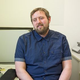 Mein Name ist Stephan Klose. Ich bin 36 Jahre alt. Ich arbeite hier im SFZ Förderzentrum Chemnitz in der dort ansässigen Berufsschule als offizieller Mediengestalter. Das bedeutet in meinem Fall, dass ich aufgrund meiner Behinderung, ich bin seit meiner Geburt blind, die ganze Gestaltung der Lehrmaterialien für unsere blinden Schüler übernehme. Das heißt die Aufgaben, die unsere Lehrer den Schülern geben wollen, übersetze ich von digitaler Normal-Schrift quasi in digitale Braille-Schrift. Ich übersetze dann die Arbeiten der Schüler, die in Braille schreiben, wieder zurück, damit die Lehrer diese wieder lesen können. Von meinen Kollegen bekomme ich gute Vorlagen, da ist es nicht mehr so aufwendig. Aber man muss sich schon Gedanken machen, gerade wenn es um Tabellen geht. Ich bereite sie so auf, dass sie für einen Blinden auch wirklich Sinn machen. Es macht wenig Sinn die 1:1 zu übernehmen. Es gibt immer wieder neue Herausforderungen. Man lernt auch immer wieder etwas dazu. Viele Themen sind ganz interessant.
