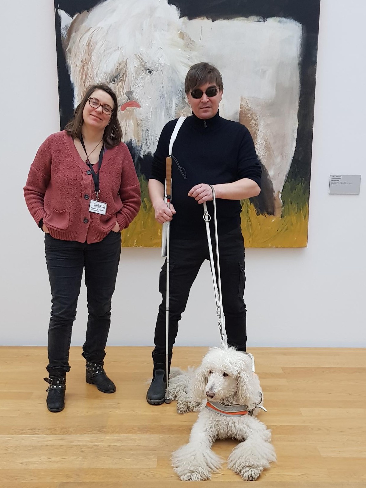 Blinden und sehenden Menschen wird Kunst erklärt.