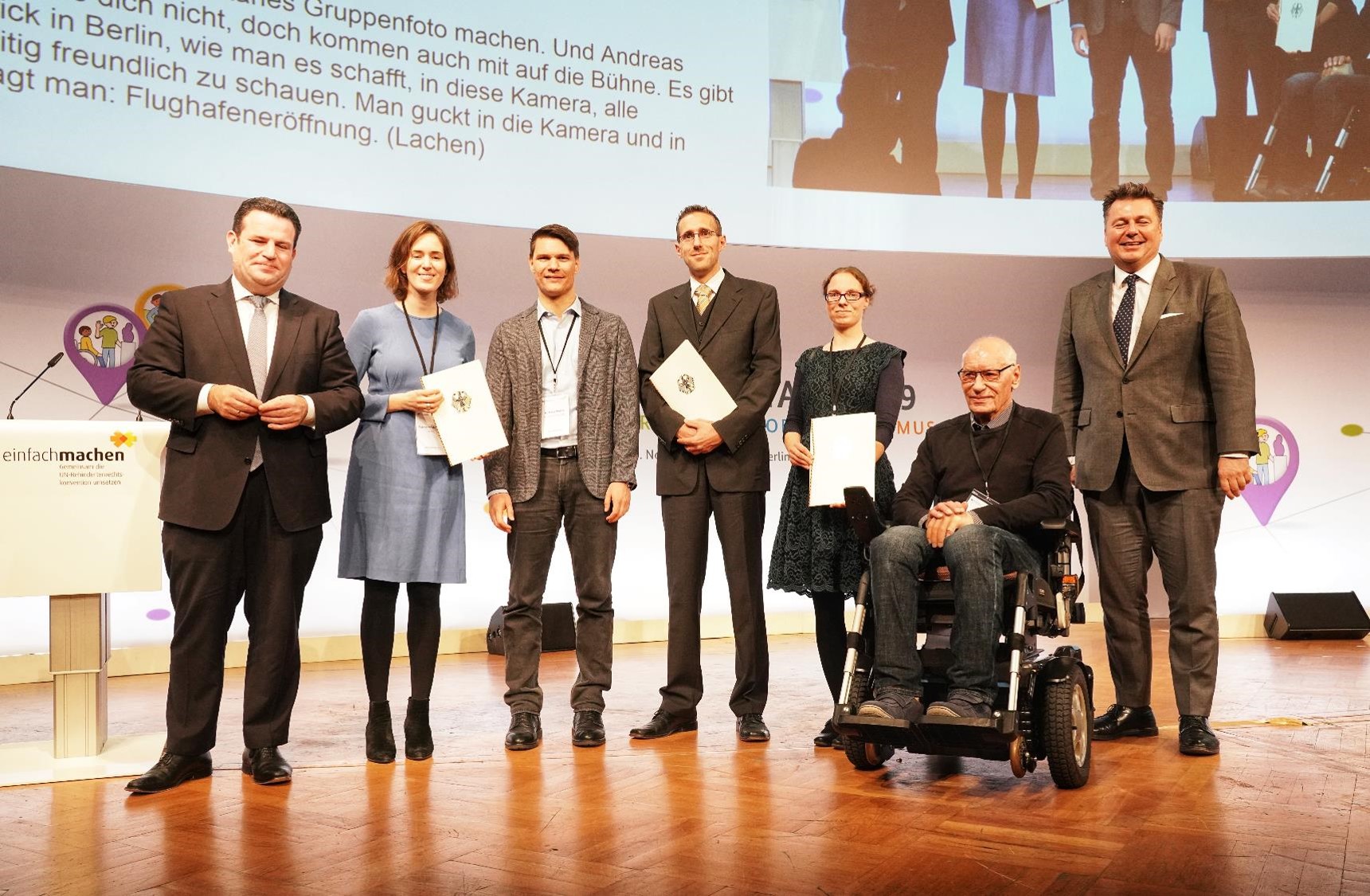 Bundesminister für Arbeit und Soziales, Hubertus Heil (1. v.l.), mit Vertretern der ersten drei Preisträger des Bundesteilhabepreises, darunter Dr. Peter Münzberg und Kerstin Vietze vom LSKS (2. bzw. 3. v.r.), Quelle: BMAS/Maelsa