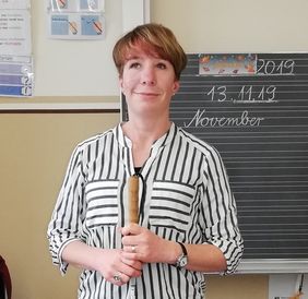 Tina Buchner gibt durch die Klasse in Stück Papier: