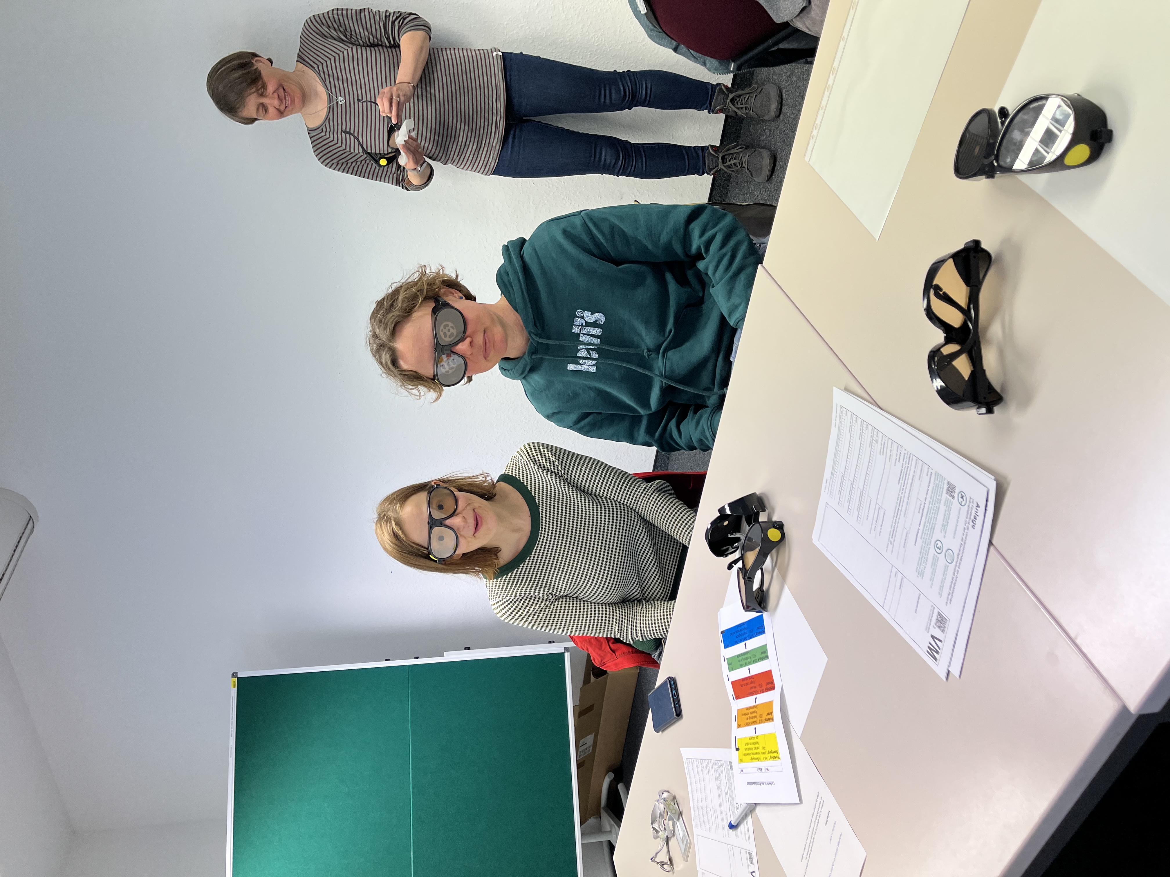 Der Workshop Sehen wurde gemeinsam von der LAG SH Sachsen und dem Blinden- und Sehbehindertenverband Sachsen e.V. (BSVS) durchgeführt. Nach einem kurzen Einführungsfilm des BSVS wurde den Mitarbeiter*innen die Perspektive von blinden bzw. sehbehinderten Menschen nähergebracht. Durch den Einsatz von Simulationsbrillen wurde ein Perspektivwechsel für die Teilnehmenden forciert und das bekannte Arbeitsumfeld aus Sicht von Betroffenen neu erkundet. Auch der direkte und offene Austausch mit den Expert*innen in eigener Sache vor Ort konnte den Mitarbeiter*innen einen Einblick in die Lebenswelt von sehbehinderten bzw. blinden Personen geben.